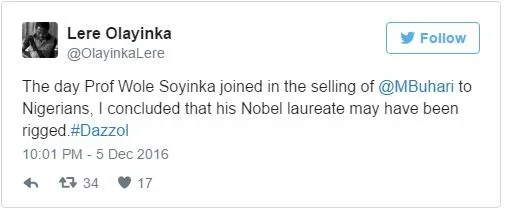 Olayinka has been a rabid critic of the playwright and Africa’s first winner of the prestigious Nobel Prize in Literature ever since Soyinka grudgingly supported Muhammadu Buhari, over Goodluck Jonathan, in the 2015 presidential election which Buhari won.